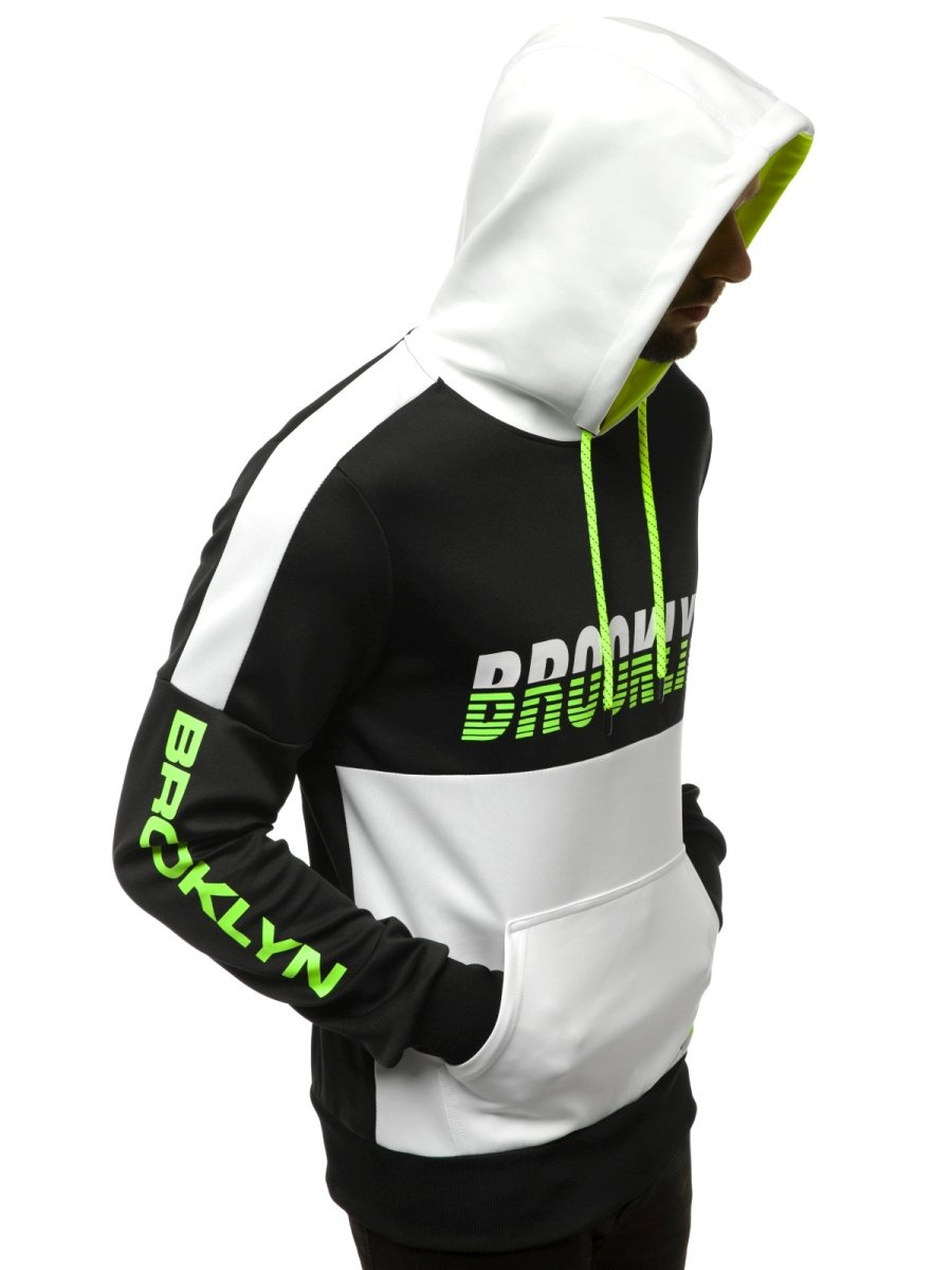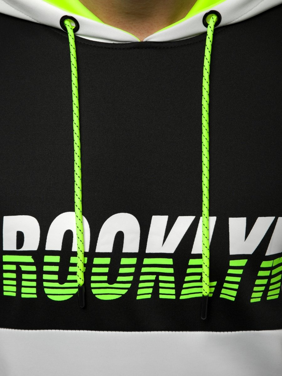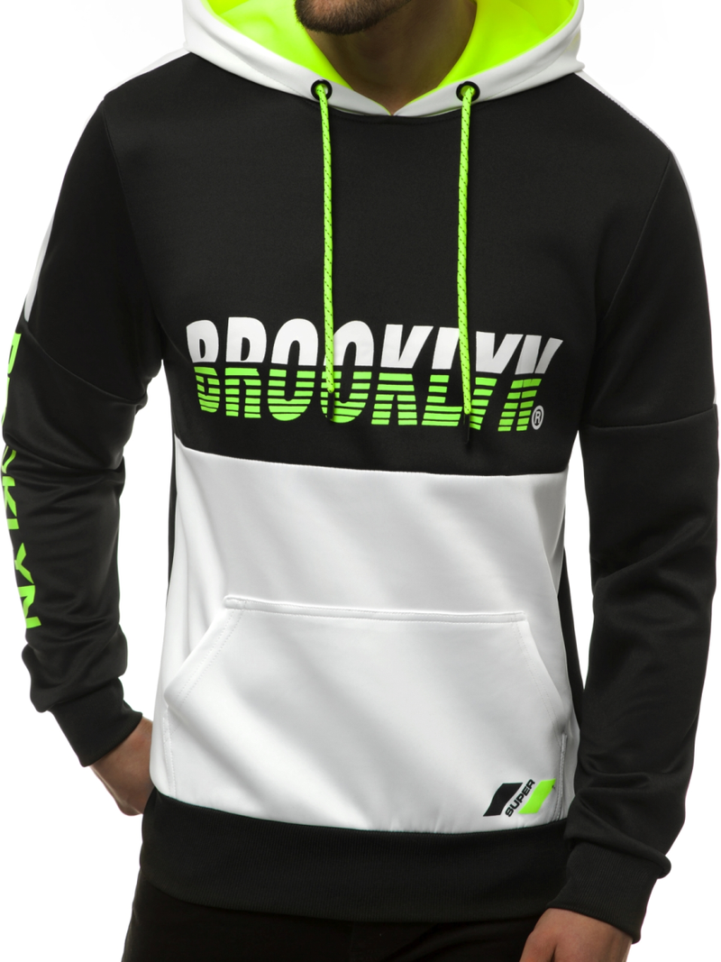Fejen át vehető fel. Praktikus kapucnival rendelkezik, amely kiválóan alkalmas a hideg, szeles, esős napokra. Kenguruzsebe van. Az alja és az ujjai összehúzottak, ami sportos karaktert ad neki, továbbá javítja a pulóver hordási komfortérzetét, véd a befújó hideg szél ellen. Elülső kontrasztos anyagkapcsolásai és nyomtatása révén látványos ruhadarab. Ez a pulóver pamutból és poliészterből készült, ami lehetővé teszi, hogy jól kövesse a test vonalát, valamint hogy kellemes tapintátú és kényelmes viseletű legyen.