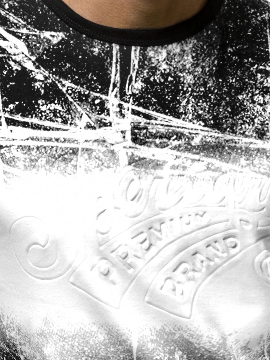 Klasszikus, kerekített U-nyakkivágással rendelkezik. Egyedi látványát a dizájnos mintájának, kontrasztos színeinek és a mellső oldalán található dombornyomtatásának köszönheti. Ez a póló pamut és poliészter keverékéből készült. Emiatt jól követi a test vonalát, kellemes tapintású, puha, kényelmes viseletű, valamint szellőző.