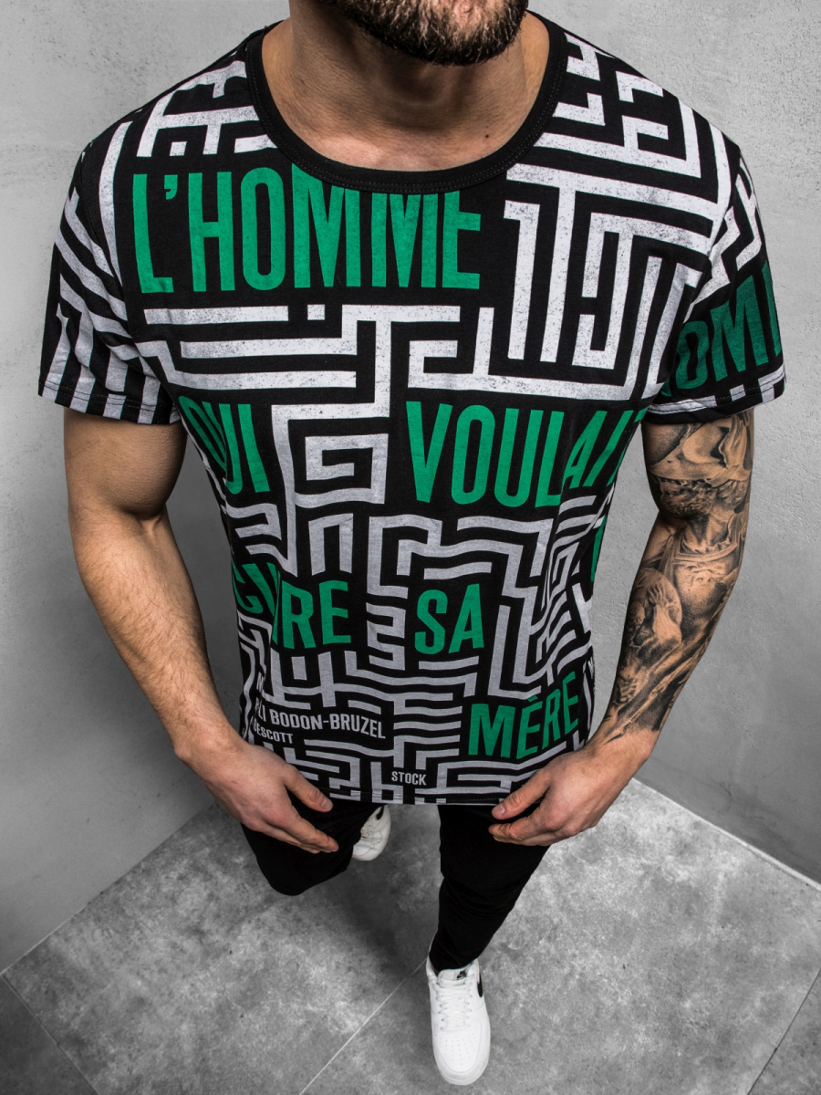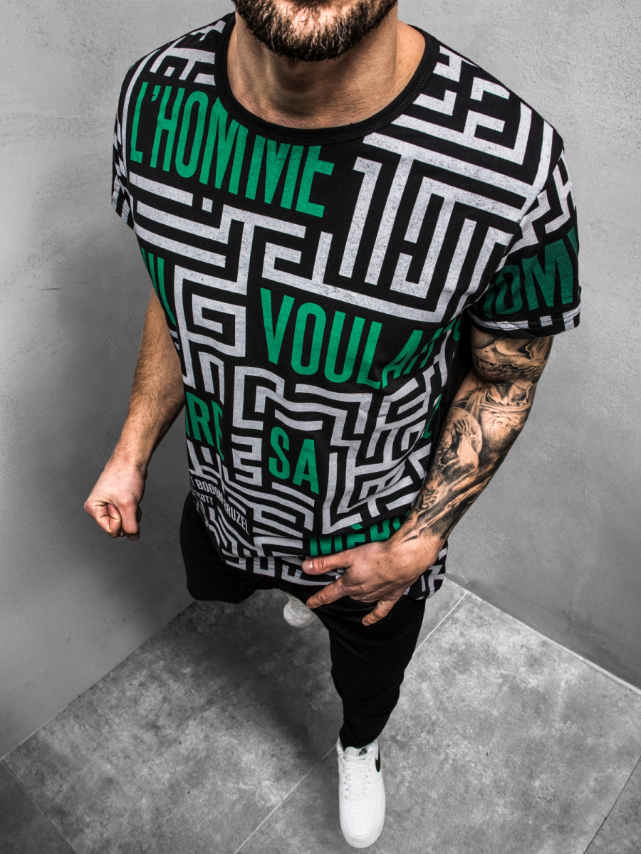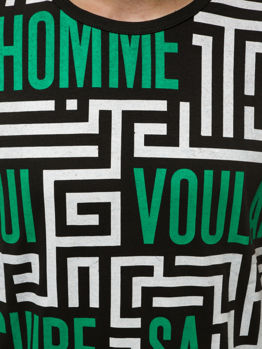 Klasszikus, kerekített U-nyakkivágással rendelkezik. Mellső részén a tekintetet megragadó, nagy méretű nyomtatás található. Ez a póló pamut és poliészter keverékéből készült. Emiatt jól követi a test vonalát, kellemes tapintású és kényelmes viseletű, valamint mindez lehetővé teszi hogy ellenálló legyen a sérülésekkel és gyűrődésekkel szemben.