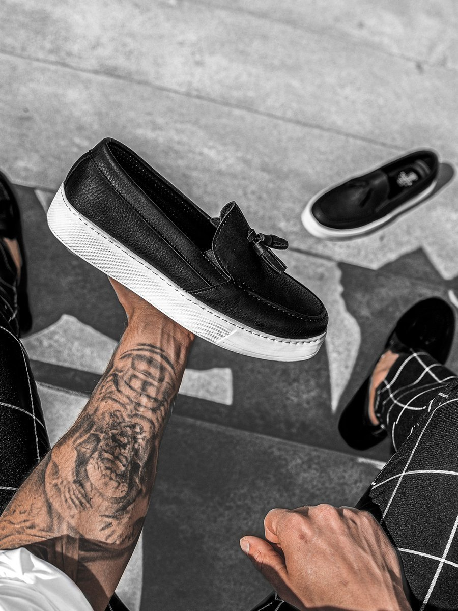 Ezt a cipőfűzőt nélkülöző cipőtípus slip-on típusúnak nevezzük. Kiváló minőségű ökobőrből, valamint műanyagból készült. Ennek a modellnek kerek elülső része van.