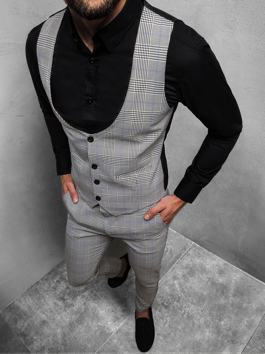 Az összeállítás két részt tartalmaz: begombolható mellényt, továbbá nadrágot aminek a zsebei elől és hátul találhatóak. Univerzális, időtálló kockával rendelkezik. A komplett gyártásához, kiváló minőségű pamutot használtak fel, ennek köszönhetően kellemes a tapintása, kényelmes a viselése, szellőző, továbbá tartós a gyűrődésekre.