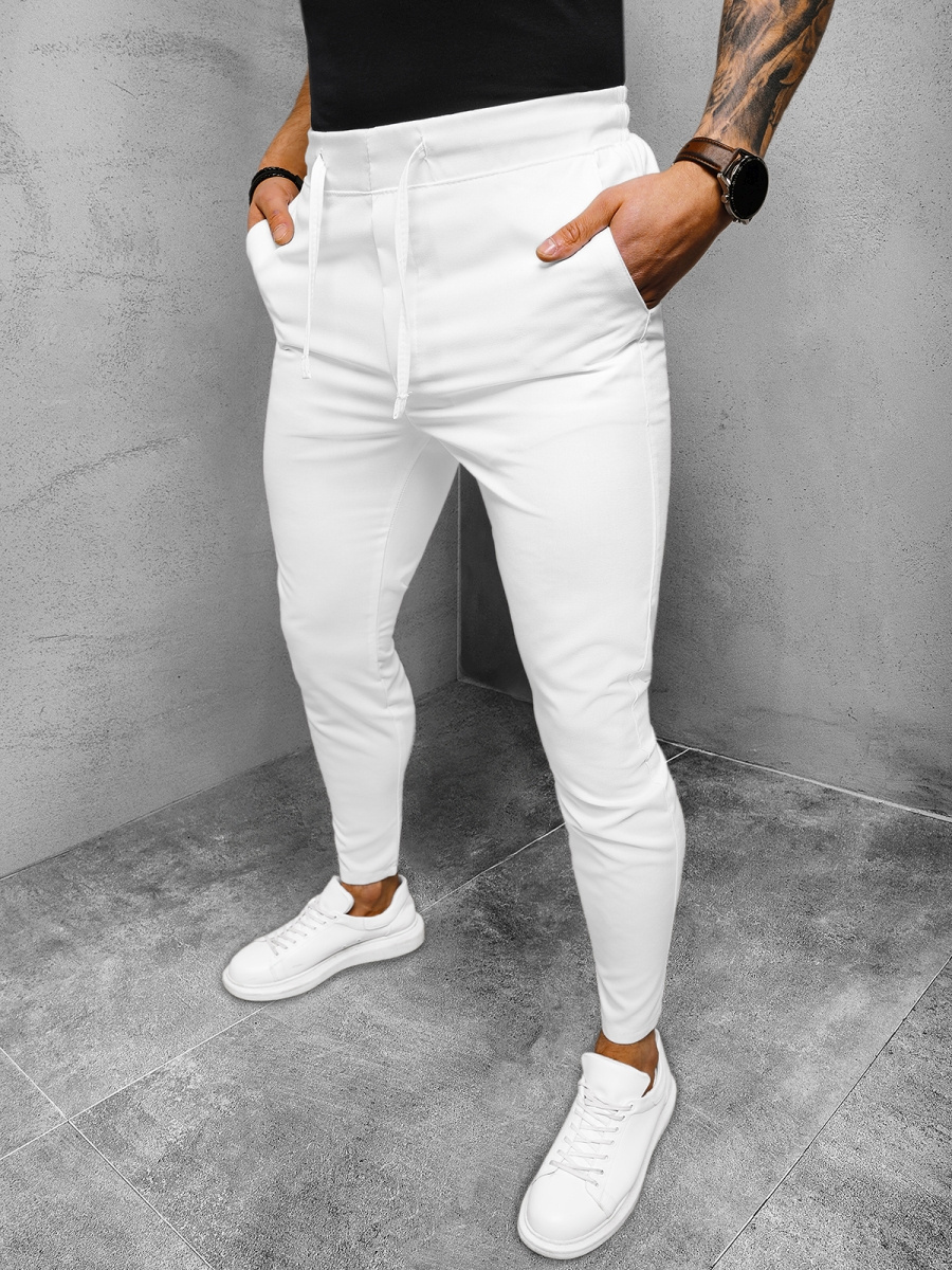 A fehér chinosok a legújabb kollekcióból kerülnek ki. Praktikus zsebekkel rendelkezik elől és hátul, amelyikbe egyszerűen elrakhatod a számodra fontos kiegészítőket, olyan mint a kulcs, telefon, vagy pénztárca. A deréknál fűzőt találunk, ezért könnyedén hozzáilleszthető a testalkatodhoz. A nadrág gyártásához pamutot használtak fel, egy kis viszkóz és elasztán hozzáadásával. Ennek köszönhetően kényelmes a viselése, kellemes a tapintása és szépen illeszkedik a testalkaton.