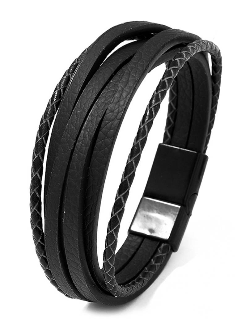 A komplett karkötő nagyon jó minőségű ökologikus bőrből készült, fonott mintázattal és szíjjal, ami fekete színű. Az elülső részen található egy díszített fém beépítés. A karkötő méretét szabályozni tudjuk fűzővel 16 és 24 cm között. Az egyik pedig tépőzáras és a teljes hosszúsága 20 cm.