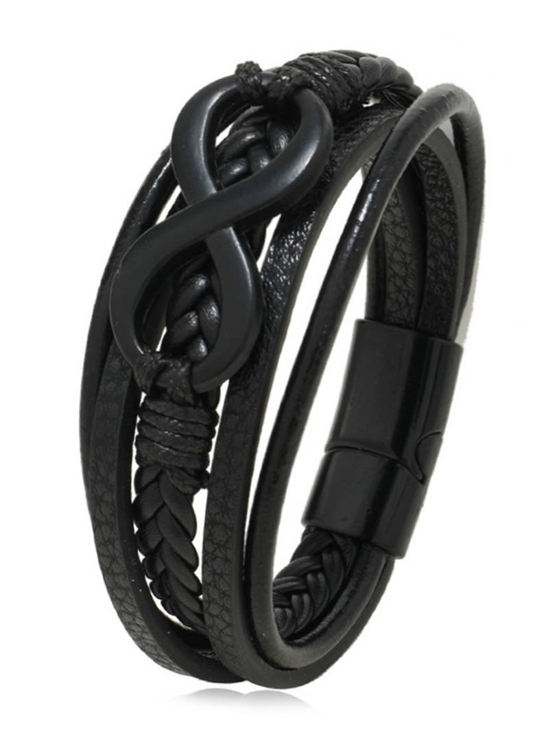 A komplett karkötő nagyon jó minőségű ökologikus bőrből készült, fonott mintázattal és szíjjal, ami fekete színű. Az elülső részen található egy díszített fém beépítés. A karkötő méretét szabályozni tudjuk fűzővel 16 és 24 cm között. Az egyik pedig tépőzáras és a teljes hosszúsága 20 cm.