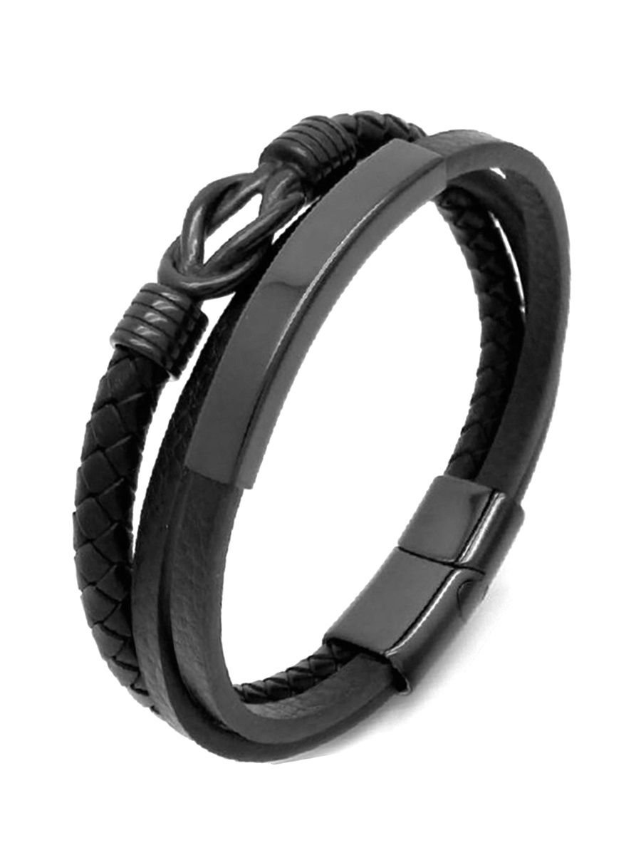 A komplett karkötő nagyon jó minőségű ökologikus bőrből készült, fonott mintázattal és szíjjal, ami fekete színű. Az elülső részen található egy díszített fém beépítés. A karkötő méretét szabályozni tudjuk fűzővel 16 és 24 cm között. Az egyik pedig tépőzáras és a teljes hosszúsága 20 cm.