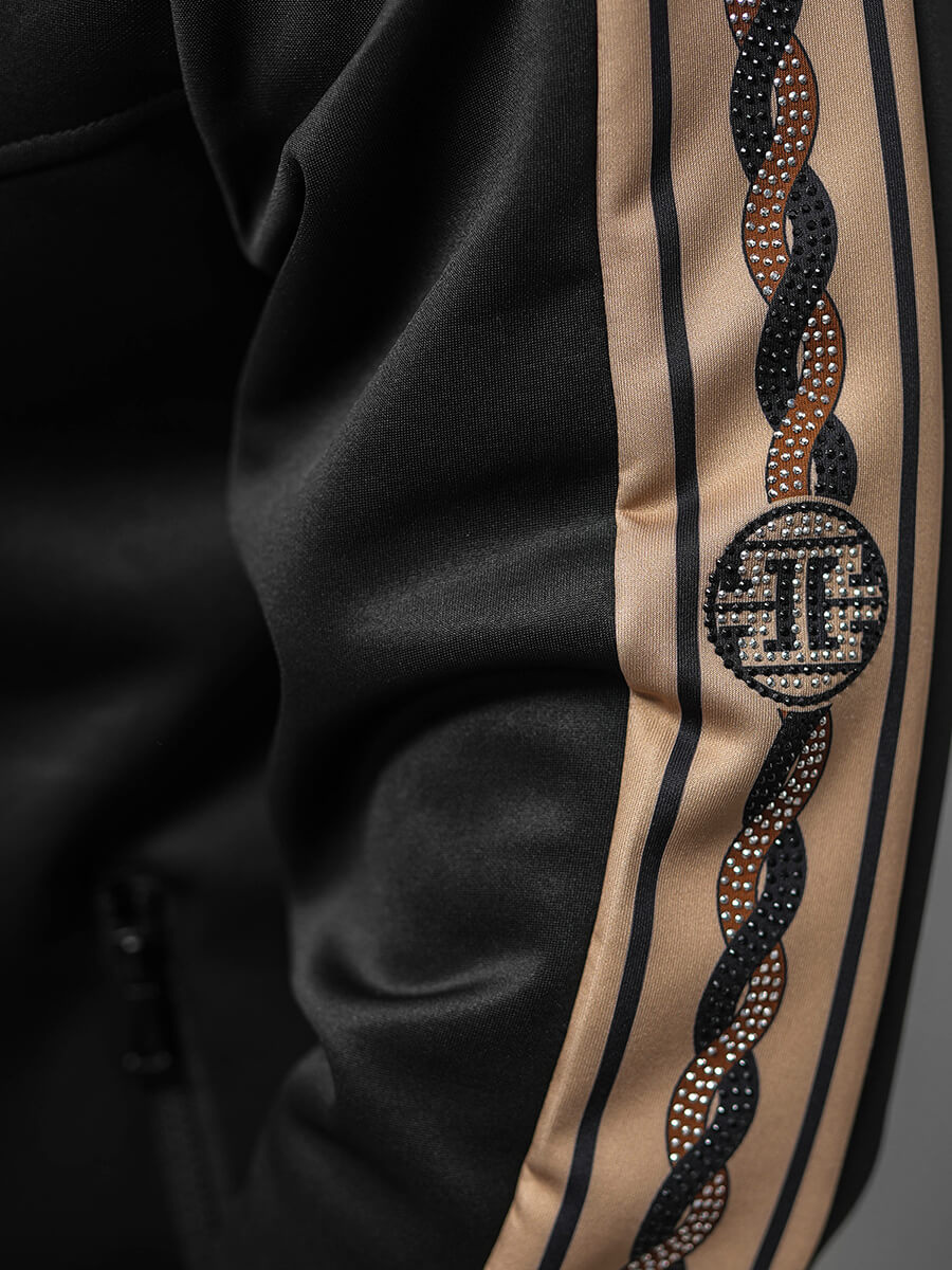 - Nadrágot pántokkal, kontrasztos csíkozással és díszített cirkóniával