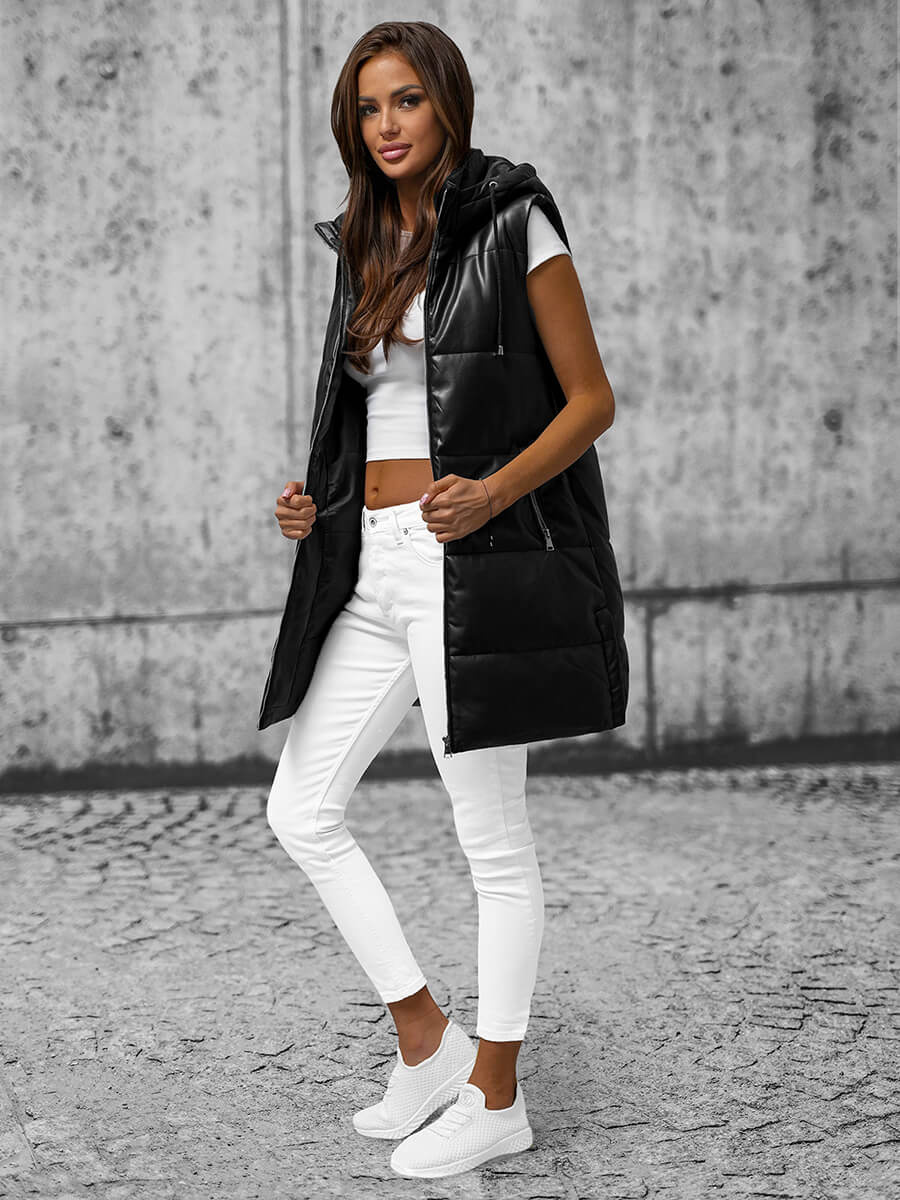 A mellény a legújabb kollekcióból kerül ki. A hosszúsága derékon túlmutat. Tűzdelésekkel rendelkezik, ami eredeti kinézetet biztosít. A mellény praktikus kapucnival rendelkezik, ami kiválóan megvéd a hidegtől, széltől és esőtől. továbbá magas kémény típusú gallérral rendelkezik, ami kiválóan be fog válni a hűvösebb napokon. Az oldalsó részén cipzáros zsebeket találunk, ahová elrakhatod a telefonodat, kulcsodat, vagy pénztárcádat. A mellény gyártásához poliuretánt használtak fel, a bélése pedig poliészterből. Szépen illeszkedik a testalkathoz, gyorsan szárad, nem gyűrődik és nehezen koszolódik.