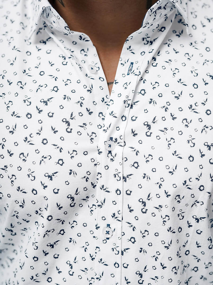 Az ing a legújabb kollekcióból kerül ki. Hosszú ujjú, kent típusú gallérral rendelkezik és begombolható. Apró, stílusos mintával rendelkezik. Az ing gyártásához, pamutot és elasztánt használtak fel, ennek köszönhetően szépen illeszkedik a testalkathoz, nem gyűrődik, alkalmas mosógépben való mosásra és kényelmes a viselése, továbbá kellemes a tapintása.