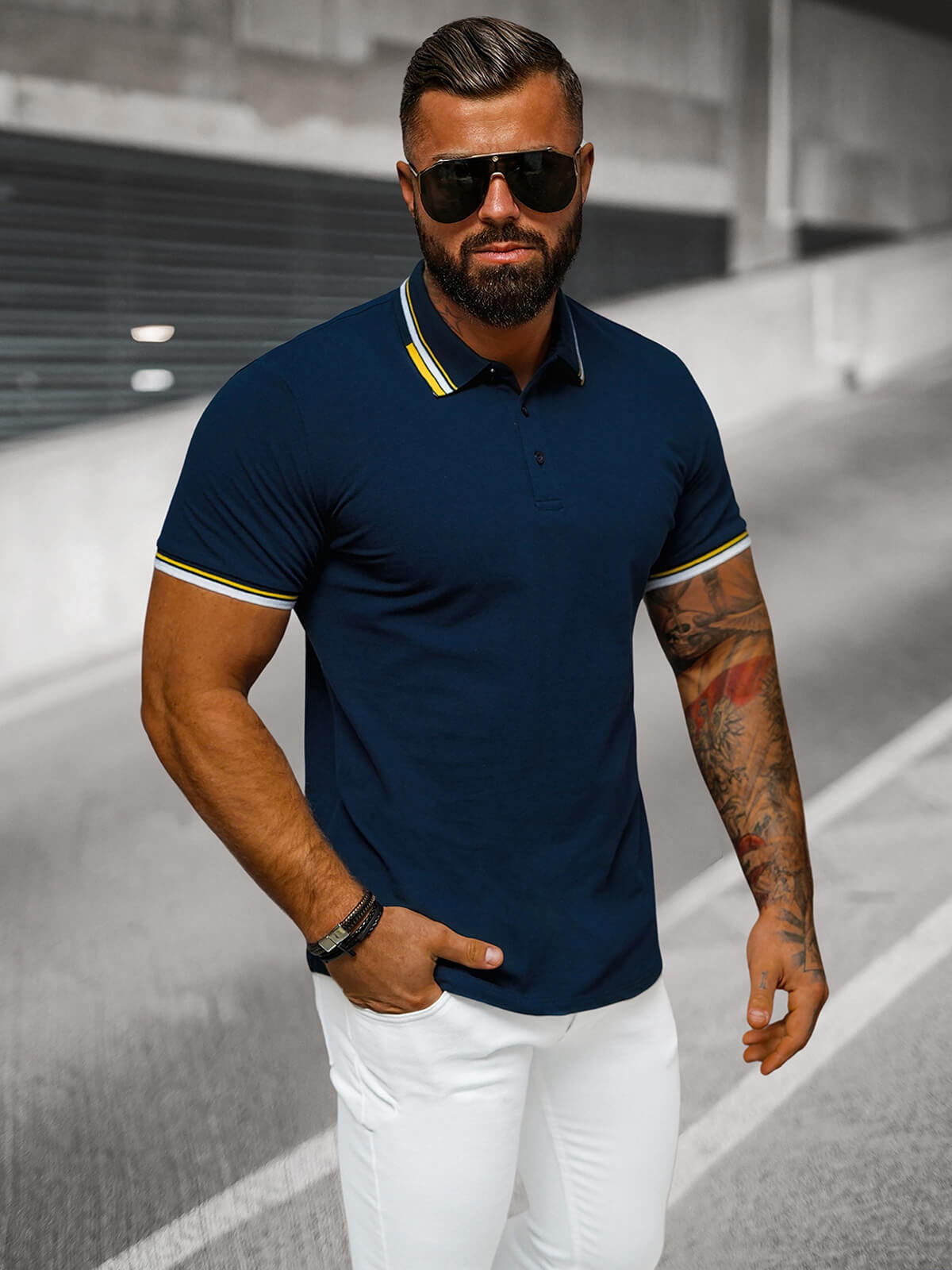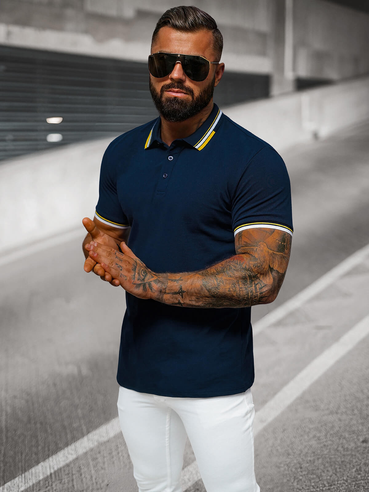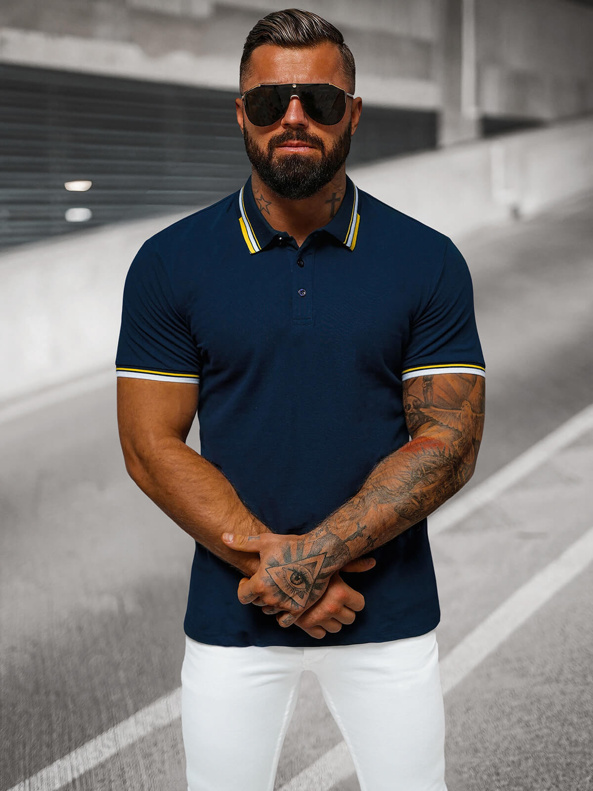 A férfi tengerészkék OZONEE O/DA736 pólóing a legújabb kollekció újdonsága, melyben a klasszikus és a kényelem ötvöződik. Kiváló minőségű kötött anyagból készült, garantálja a tökéletes illeszkedést a sziluetthez. Klasszikus Kent gallérral rendelkezik, amely elegáns jelleget kölcsönöz neki. Gombos, bordázott mandzsettával, nemcsak kényelmes, hanem funkcionális is.