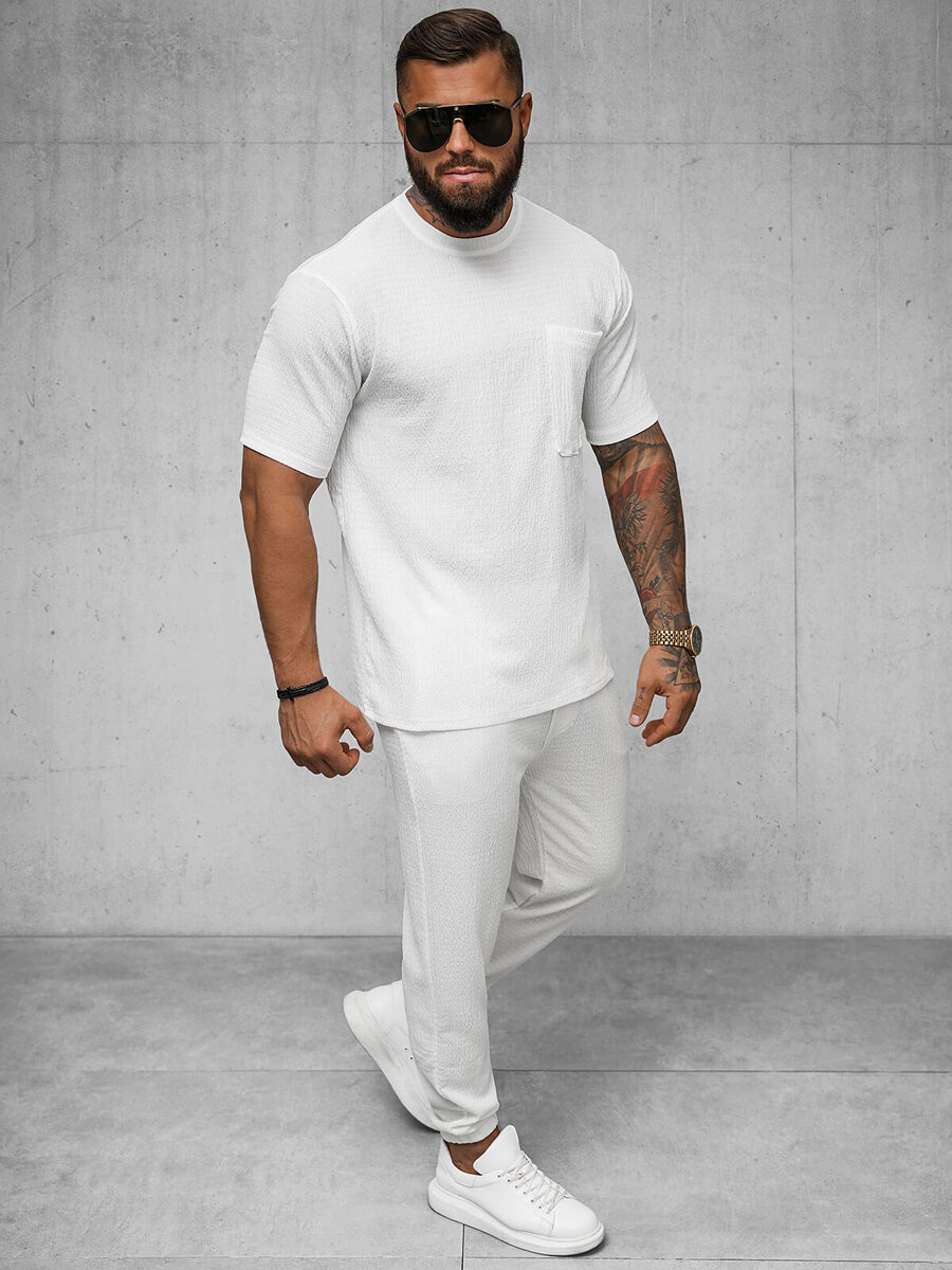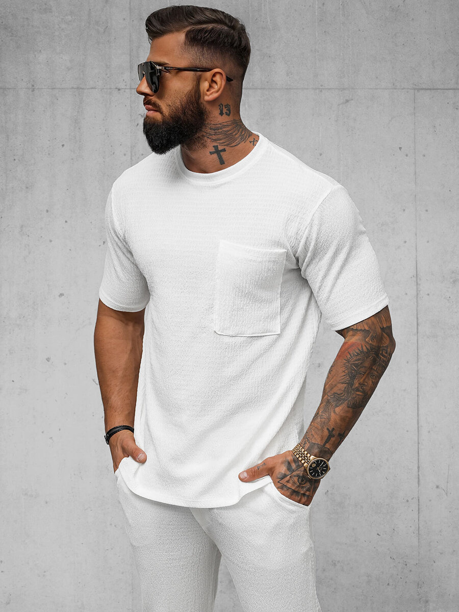 A bemutatott férfi fehér OZONEE O/Y960T póló a kényelmet és a divatos megjelenést értékelő férfiak számára jelent lehetőséget. Kényelmes kötött anyagból készült, garantálja a mozgásszabadságot, és tökéletes a mindennapi viselethez. A divatos domborított minta eredetiséget kölcsönöz neki, míg az elöl található praktikus zseb funkcionalitást biztosít. A póló a legújabb kollekció része, ami hangsúlyozza aktualitását és az aktuális trendeknek való megfelelését.