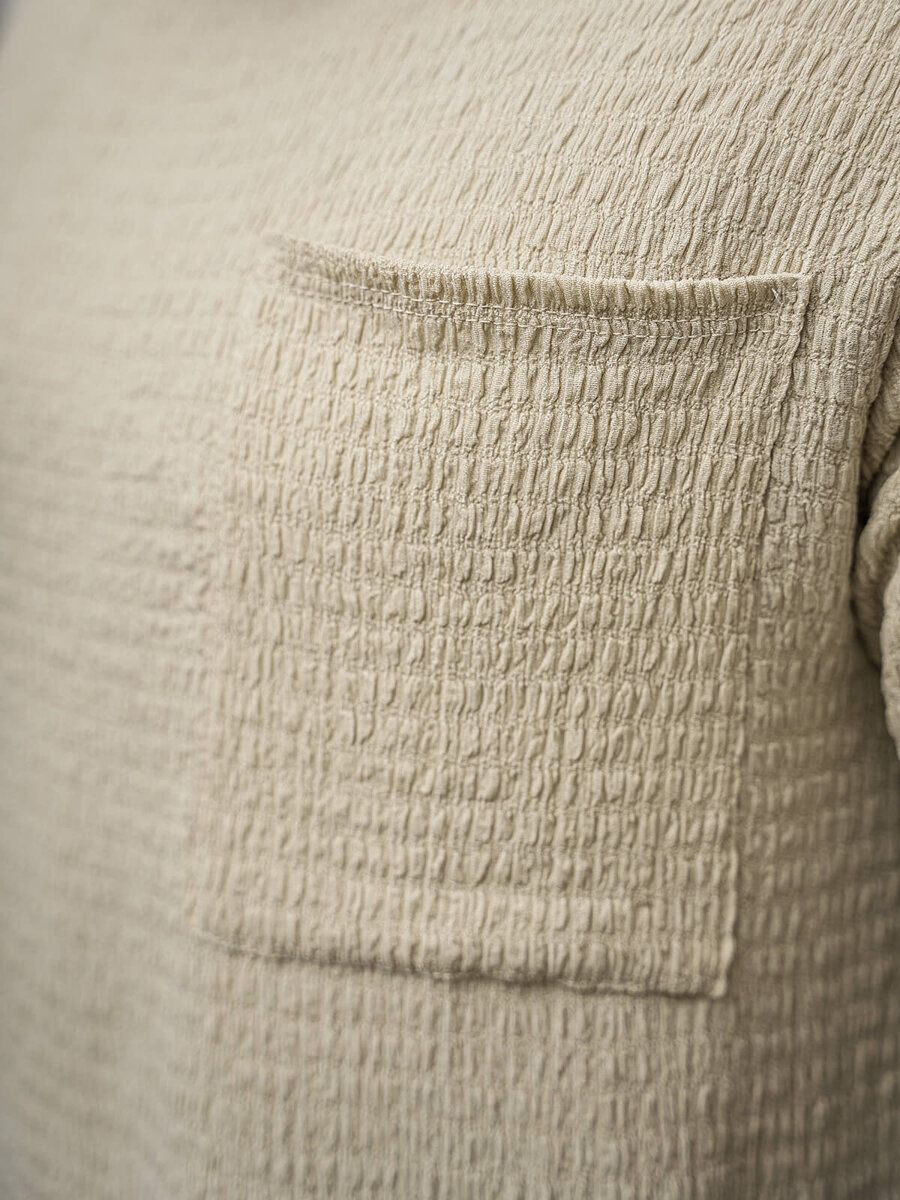 Hangsúlyozza férfias eleganciáját az OZONEE új férfi basic póló kollekciójával. A legmagasabb minőségű kötöttáruból készült bézs színű póló nemcsak kivételes viselési kényelmet, hanem divatos megjelenést is biztosít. Egyedülálló dombornyomott mintázatával tűnik ki, amely egyedi jelleget kölcsönöz a viseletnek. Ezenkívül a póló elöl egy praktikus zsebbel van ellátva, ami növeli a funkcionalitását.