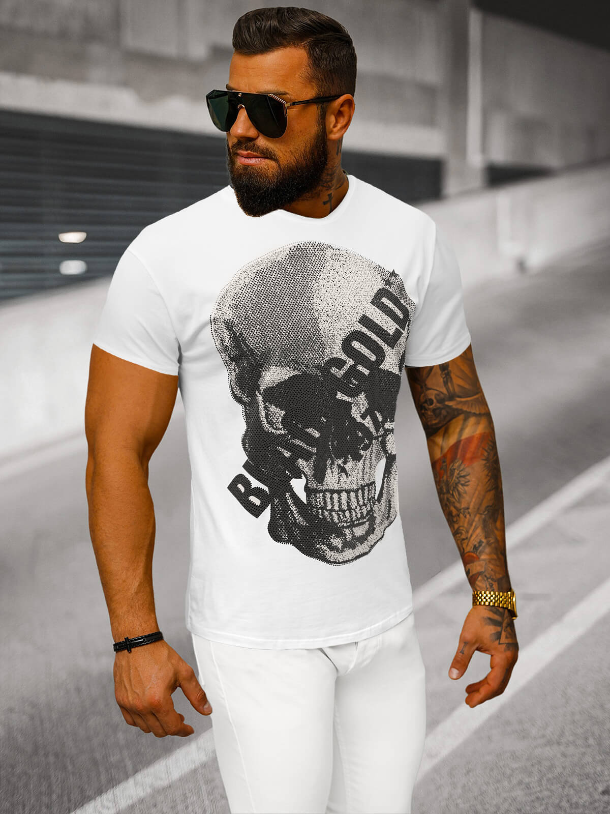 A póló, a legújabb kollekcióból kerül ki. Slimfit típusú fazonnal rendelkezik, azaz testhez illeszkedő, továbbá U-neck dekoltázzsal rendelkezik. A középső részén a pólónak, nagy feliratot találunk koponya motívummal, díszített fényes cirkóniával. A póló gyártásához pamutot és elasztánt használtak fel, ennek köszönhetően kényelmes a viselése, kellemes a tapintása, szépen illeszkedik a testalkathoz és nem gyűrődik.