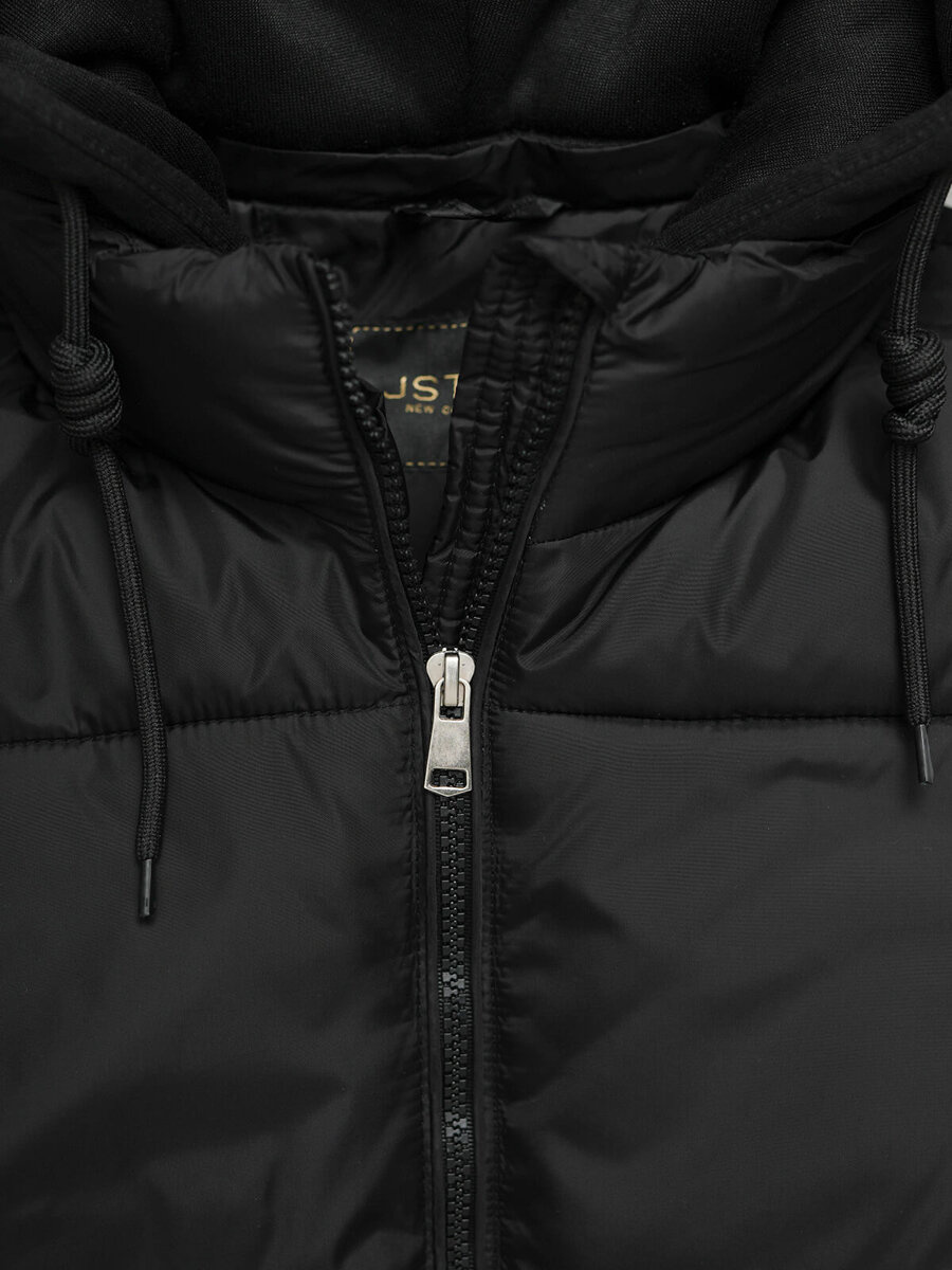 A legújabb kollekció modellje, Cipzáras, Levehető kapucni, amely egy pulóvert imitál, Divatos steppelés, Zsebek az oldalán, Bordázott mandzsetta