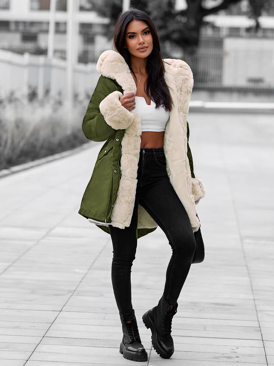 A kabát a legújabb kollekcióból kerül ki. A termék cipzáros. A termék könnyedén hozzáilleszthető a deréknál, ezzel megjelölheted a női testalkat előnyeit. A kabát oldalsó zsebekkel rendelkezik, ezekbe elrakhatod a számodra fontos kiegészítőket, olyan mint a kulcs, pénztárca, vagy telefon. A kabát szőrmével rendelkezik a kapucninál, cipzárnál és az ujj részénél, ami stílusos karaktert biztosít. A kabát gyártásához kiváló minőségű poliésztert használtak fel, ennek köszönhetően tartós a gyűrődésekre és szépen mutat a testalkaton.