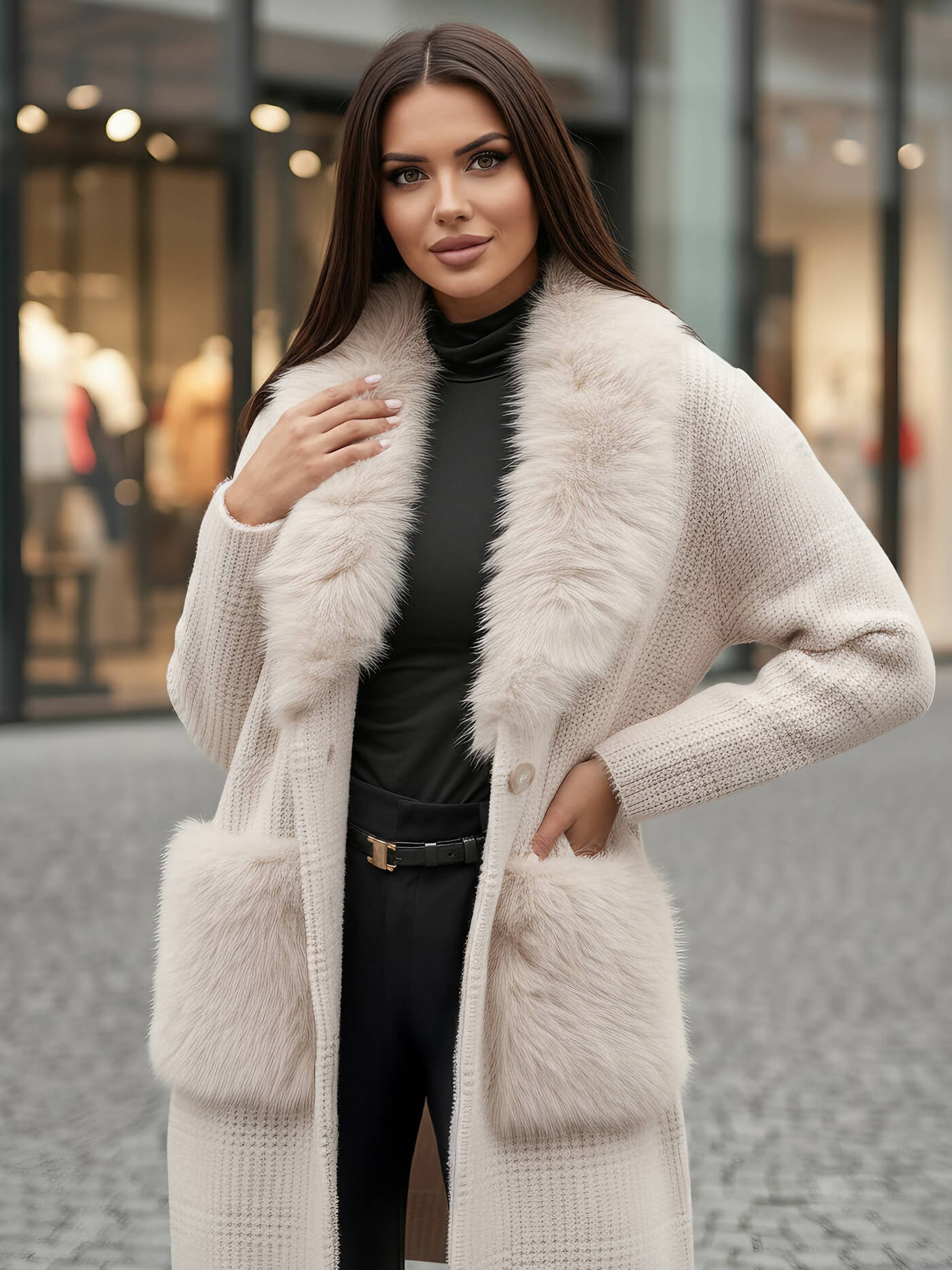 - Oldalzsebek szőrmével; Anyag: 41% viszkóz, 31% nejlon, 28% poliészter.
