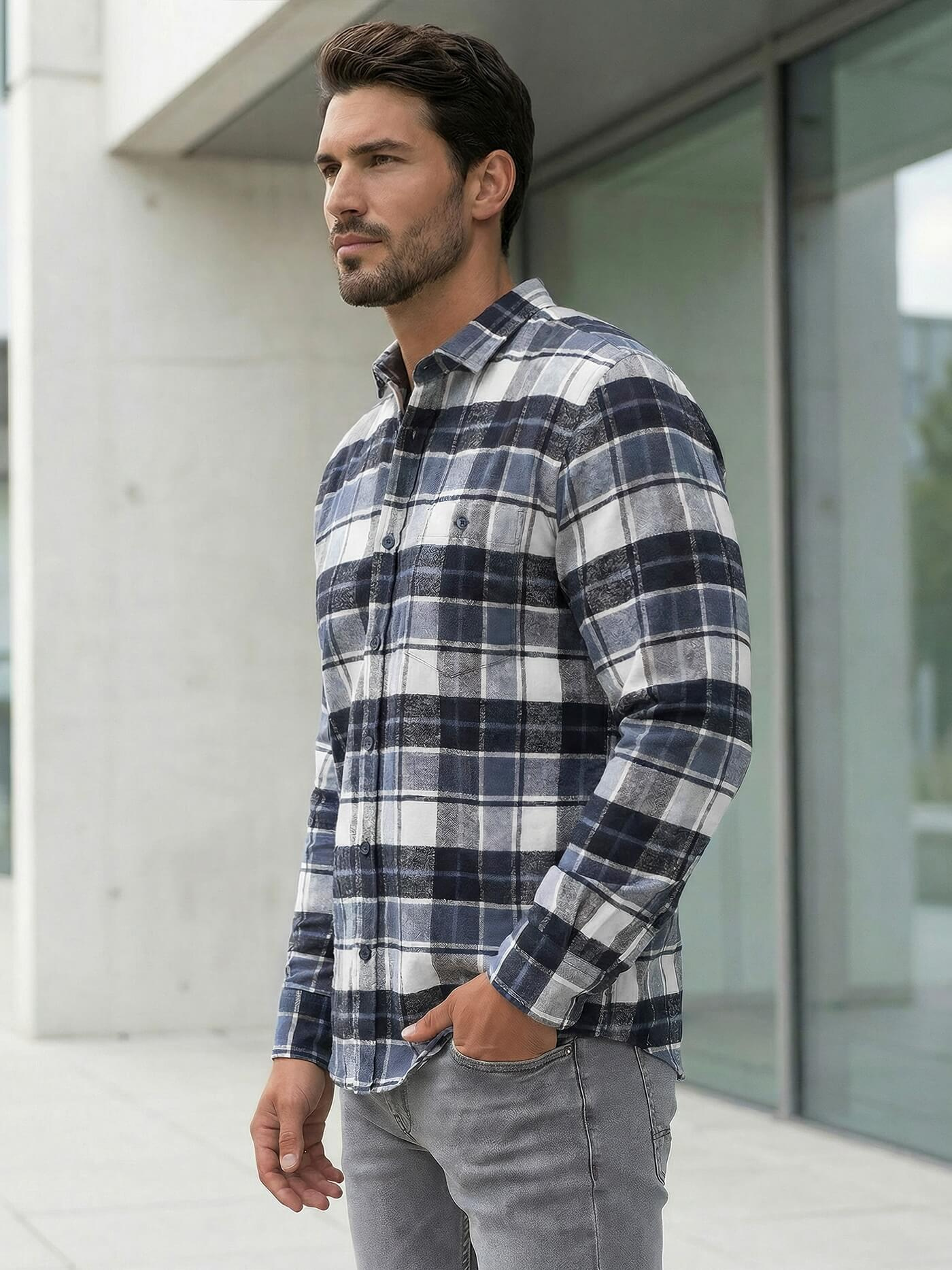 - Modern kockás minta; Gallér button-down; Anyag: 50% pamut, 50% poliészter.