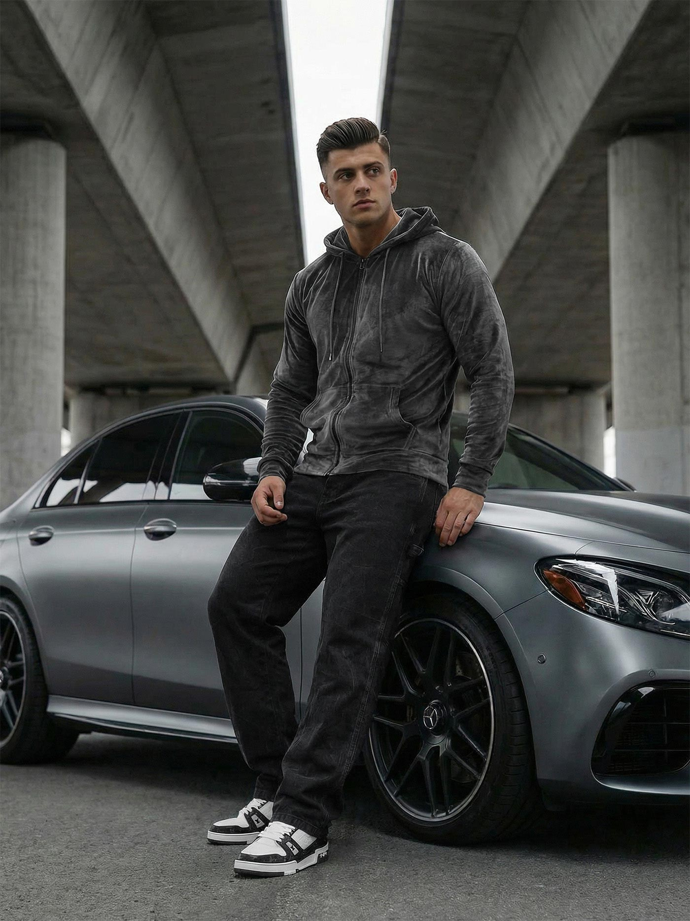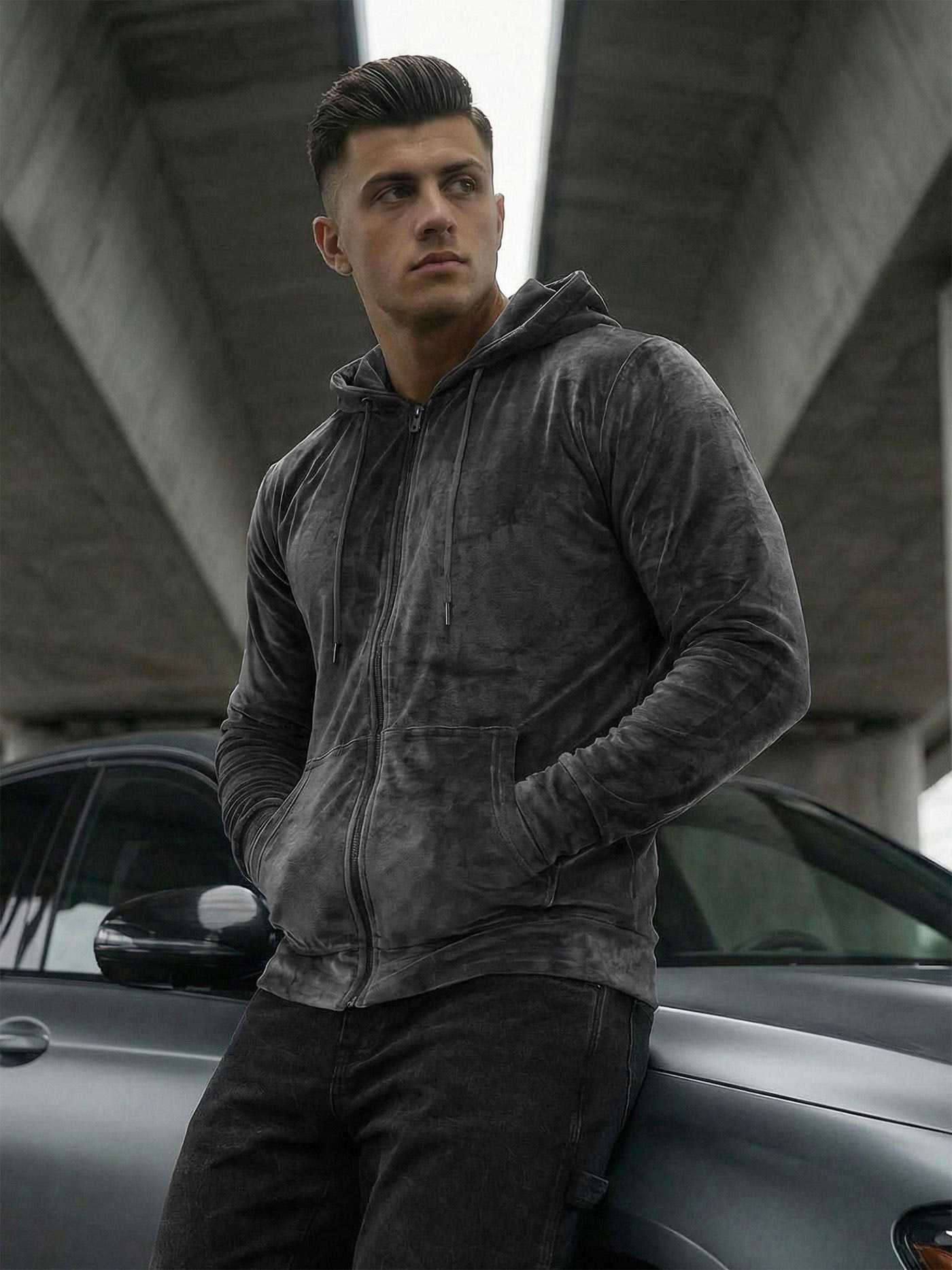 Férfi grafit velúr kapucnis pulóver OZONEE JS/8B1168/6Z a kényelem és a modern design kombinációja. A legmagasabb minőségű anyagaów-ból készült, egész napos kényelmet biztosít. Cipzárral záródik, kapucnival rendelkezik, amely egyedi jelleget kölcsönöz. A bordázott szegéllyel befejezett alja és ujjai hangsúlyozzák a sportos stílust.